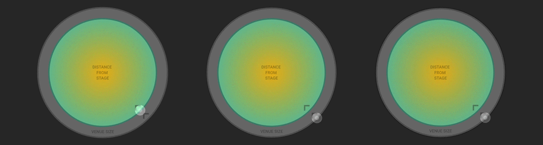 By simply changing the sizes of "Venue Size" and "Distance from Stage" circles and the sound power bar value, the user controls how the HARMAN Voyager Next DSP changes the EQ parameters and other sound parameters, and actually hear in realtime how the sound is changing.